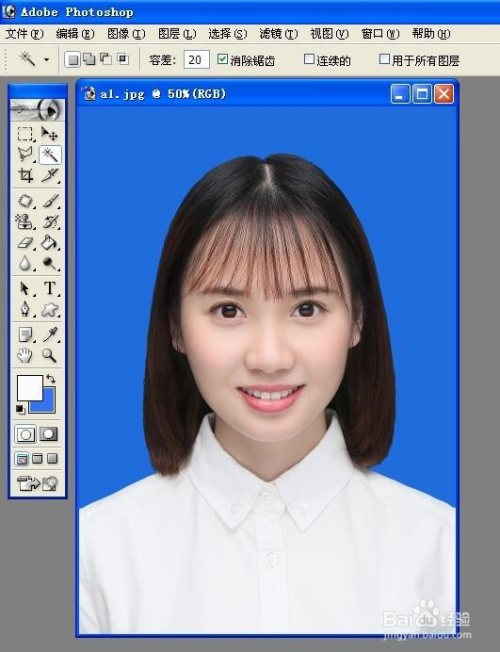 操纵Photoshop中的魔术棒东西,快速改换证件照的布景颜色。