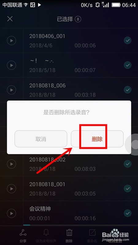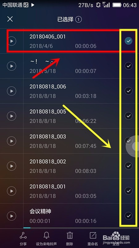 我们此时长按某个需要删除的灌音文件,可以看到该文件后边打上了勾,每个文件后都呈现了小圆圈;