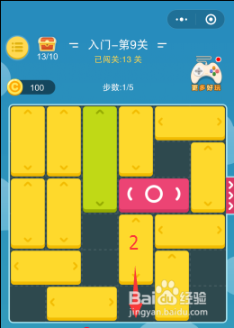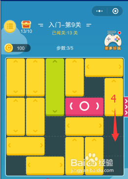 进入第九关卡,将最底下的横排方块标的目的左移动一格后,再把其右边的一个竖排方块,拖至底部,接着移动倒数第三行的横排方块到图中位置,最后把挡路的竖排方块标的目的下拖动,即可(在五步内)完当作游戏!