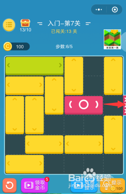 进入第六关卡,依次移动挡路的四个竖排方块,最后再把红色方块,拖拽到终点,即可(在五步内)完美闯关!