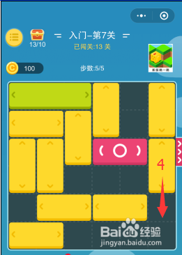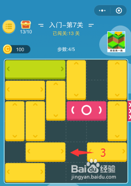 进入第七关卡,先标的目的上移动左边的第二个竖排方块,再标的目的左移动倒数第二行的两个横排方块,最后再把挡路的最右边的竖排方块下移,即可扫清障碍,(在五步内)完美通关!