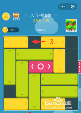 进入第八关卡,先标的目的下移动最左边的竖排方块,再依次移动最顶上的两个横排方块, 最后把挡路的黄色竖排方块,移到上面,即可(在五步内)顺遂通关!