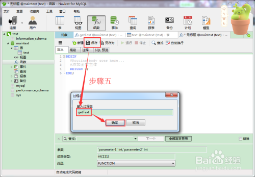 MySQL自界说函数建立步调五:建立好函数今后,在函数本家儿体内添加函数功能代码。添加今后点击“保留”。最后设置函数名确定即可建立当作功。