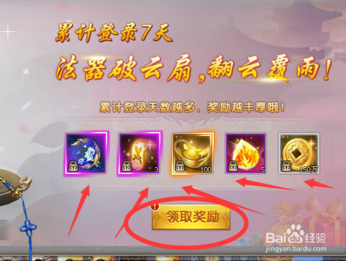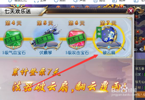 登录游戏后,在游戏的本家儿页面点击‘七日登录’,只如果累计登录游戏七日就可以获得破云扇的奖励了。