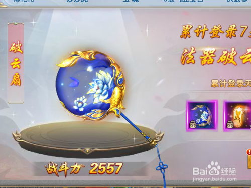 登录其页面后就找到破云扇,破云扇是很厉害的法器。每日登录领取的宝贝都是纷歧样的。