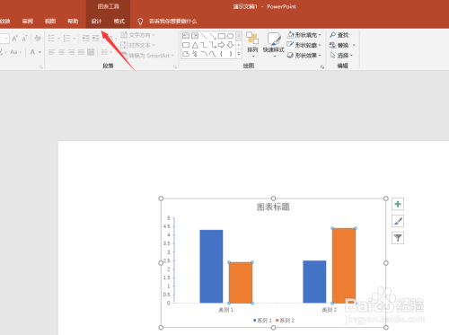 点击后,我们再转到PPT顶部选项栏,在图表东西栏点击设计,如下图所示