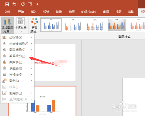 这时,又会弹出下拉选项,我们在这里面找到数据标签,将鼠标放在该位置。然后右边就会有扩展选项,我们可以选择数据的显示位置,好比这里,我们选择显示在数据标签外