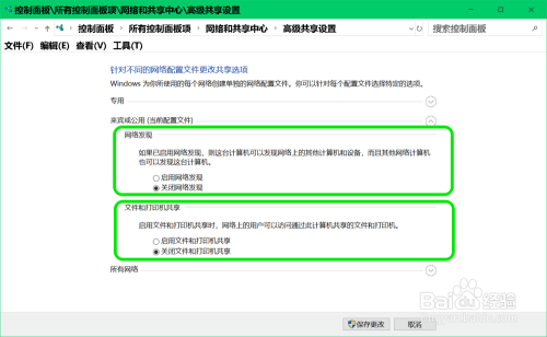 第三步:在节制面板中封闭【收集发现】及【文件和打印机共享】