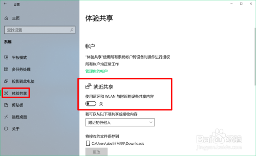 在系统设置窗口的左侧,找到并点击【体验共享】,在对应的右侧窗口中可以看到【就近共享】- 利用蓝牙和WLAN与四周的设备共享内容的开关已处于【关】的位置(在通知中间已封闭就近共享),若是处于【开】的位置,则点击使之处于【关】的位置;