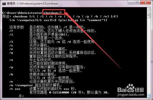 若是不知道shutdown 的参数可以输入 shutdown/? 回车,然后就可以看到各个参数的意思了。