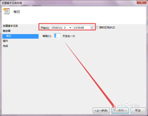 然后在弹出的 使命触发器 页面中按照现实需要选择,然后点击 下一步。