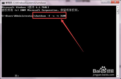 然后会打开一个 黑色的号令行窗口,在当前的窗口中输入 shutdown -f -s -t 3600 回车,然后在桌面的右下角就会弹出多久封闭计较机的提醒了。