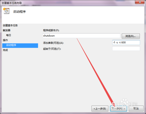 然后在打开的启动法式页面中点击下一步,然后输入 shutdown 或者是直接选择C:\Windows\System32\shutdown.exe 的这个关机法式,可以按照现实需要选择是否输入参数,点击下一步。
