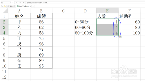 在辅助列中填入各分段区间的数值,本教程是0到60,60到80,80到100,故填入60,80,100.