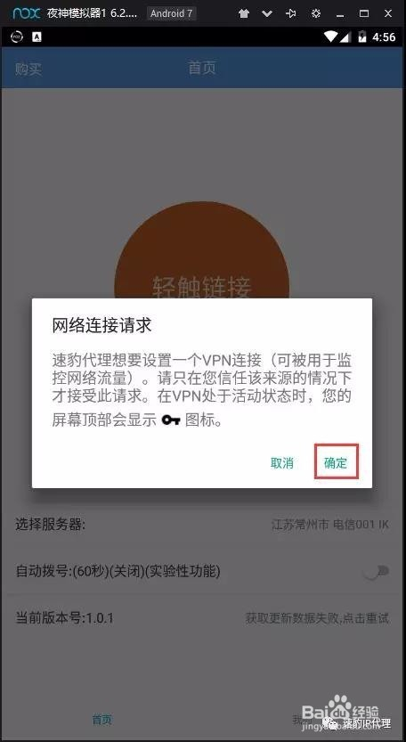线路选择好后点毗连会弹出一个扣问窗口,点确定。毗连当作功后如下图,然后在模拟器里的浏览器打开百度来查一下IP是否改变,如图所示,IP已酿成毗连线路的IP