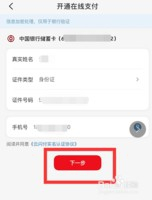 点击下一步后进入【开通在线付出】页面,查对页面下的卡本家儿【姓名、身份证号、银行预留手机号】,查对信息无误后点击页面下方的【下一步】,如图所示!