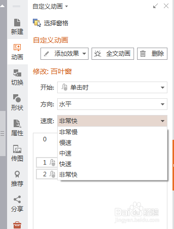 然后我们看到选择之后,在点窜这里,有起头,偏向,速度可以进行调整,那么可以按照想要的环境进行调整,例如若是想做快闪,就需要对画面和字体的速度要求比力高,这个时辰选择速度比力快,或者本身调整快点的速度就可以拉