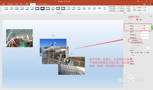 拖动鼠标用鼠标框选的方式将残剩的三张图片同时进行选中,然后在设置图片格局窗口中,先将“锁定纵横比”的勾选去失落,然后在宽度与高度的数值输入框中输入上一张缩小的图片的宽度与高度。