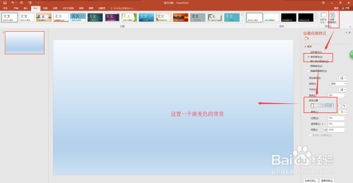 新建或者是打开一个PPT演示文稿文件,在开始菜单中找到并单击执行“设置布景格局”号令,然后在设置布景格局窗口中选择渐变填充,为其填充一个渐变颜色。