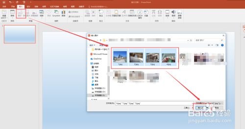在插入菜单中执行插入图片号令,弹出插入图片选择窗口,在该窗口中将我们要插入的多张图片进行选中,然后点击插入将多张图片插入到幻灯片页中。