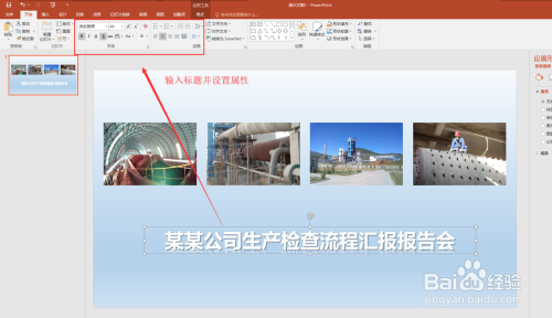 在插入菜单中的插入文本框号令中找到横排文本框,然后在幻灯片的下半位置上插入一个文本框,在文本框中输入PPT的题目,并设置题目的属性。如许一个多图型的常规PPT封面页就建造完当作了,当然你还可以进一步的加logo和润色,使封面页更美不雅。
