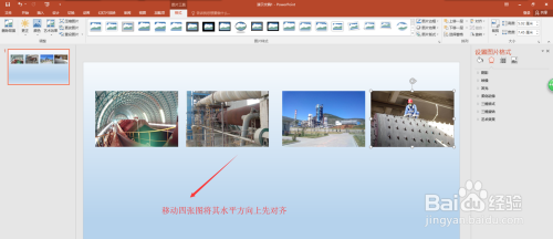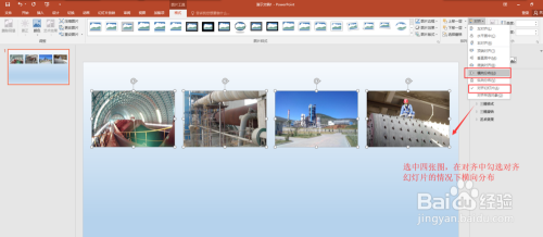 别离选中四张图片,将其移动位置,使其在程度偏向上面先对齐;然后同时选中四张图片,执行格局中对齐号令,先勾选“对齐幻灯片”,然后在单击执行横标的目的对齐。