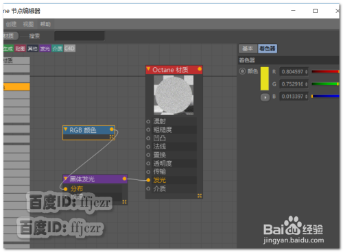 新添加一个漫射材质,将漫射选项去失落;转到节点编纂器中,添加一个黑体发光节点,将其毗连到材质的发光选项中;添加一个RGB颜色节点到黑体发光的分布毗连点,点窜颜色节点的颜色为黄色。