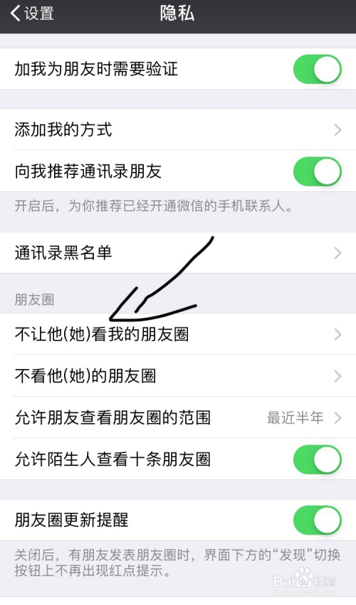 然后点击“不让他(她)看我的朋友圈”