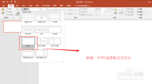 打开或新建一个PPT2016演示文稿,然后先设置好PPT2016演示文稿的板式,在开始菜单下面的板式中选择并应用一个空白的板式结果。