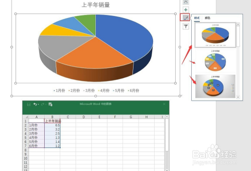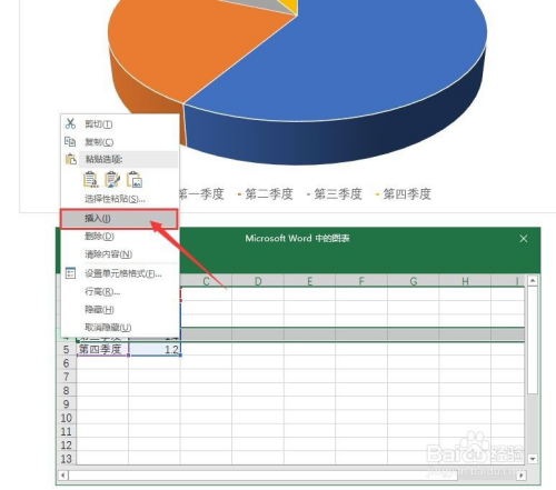 插入的是一个饼状图和excel表,对饼状图进行外形编纂,对excel表进行数据内容编纂。按照内容几多可以在excel表中插入-行。