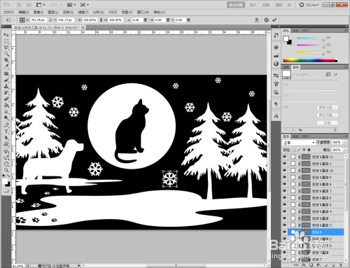 完当作对“雪花”的移动复制和大小调整后,将月亮的外形图层更改为黄色,利用【自定外形东西】建造的作品便完当作了。