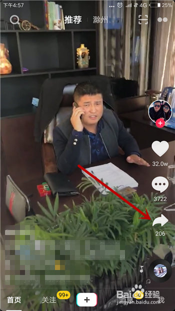 打开抖音后就可以起头播放短视频了,想要下载抖音短视频的话需要点击【转发】选项。
