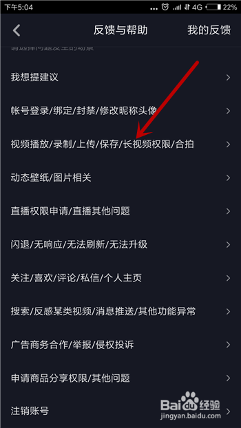 在帮忙与反馈里面找到【视频播放/录制/上传/保留/长视频权限/合拍】选项并点击。