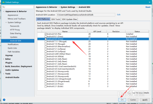 这里以安装Android SDK 8.0为例,勾选前方的复选框,点击下方的Apply按钮,并赞成相关的和谈,即可安装默认设置装备摆设的SDK