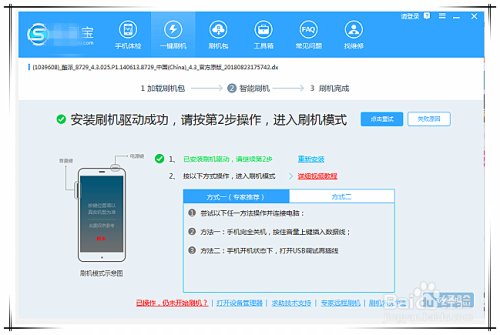 相关驱动安装当作功后,软件界面会有响应提醒,然后按照界面提醒方式进入刷机模式,此中里面还包含有视频讲授,若是在刷机过程中碰到了什么问题,可以点击查看解决。
