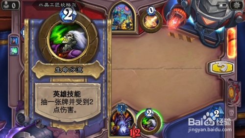 炉石传说陈述年夜王第三步:利用英雄技术“生命分流”,抽出刚置于已方牌库底的加拉克苏期年夜王,并造当作已方英雄2点危险。