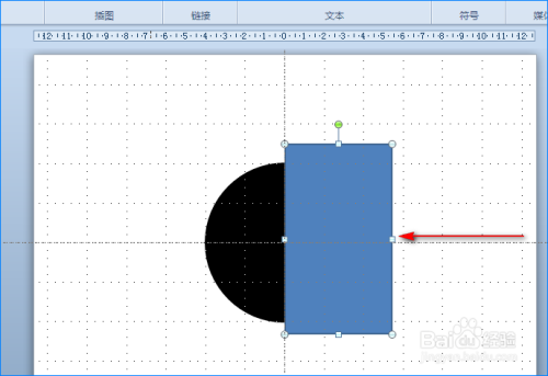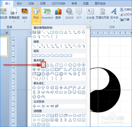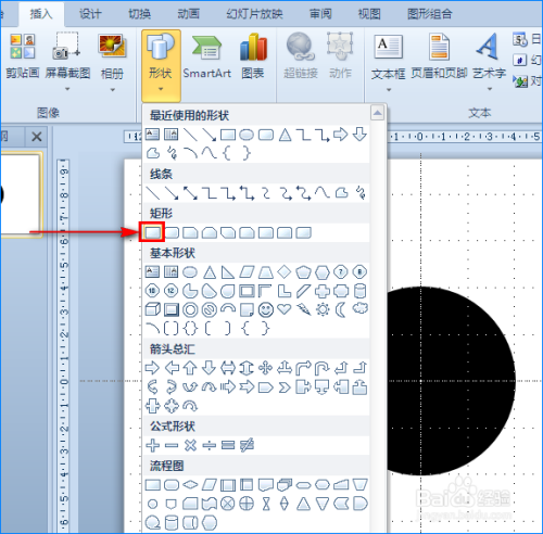 圆形画好后,我们将圆形的填充颜色和边框颜色都设当作黑色。接着我们将PPT幻灯片的网格线和参考线调出来,便于图形位置调整。然后我们再次点击“外形”选项,在其子项中选择“矩形”图形,将“矩形”图形插入到幻灯片中,确保矩形能笼盖圆形的一半。如图所示: