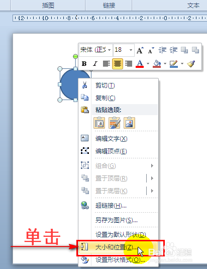 接着在PPT幻灯片空白处点击一下,这时就呈现了一个图形。然后我们单击鼠标右键,在弹出的扩展框中选择“大小和位置”选项,这时将会弹出对话窗口。如图所示: