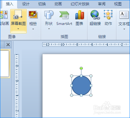 最后我们再次点击“外形”选项,选择“椭圆”外形并插入幻灯片中。将插入的图形高度和宽度都设置为1厘米,如许图形就是个圆形。接着将小圆形再复制一个。如图所示: