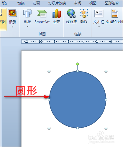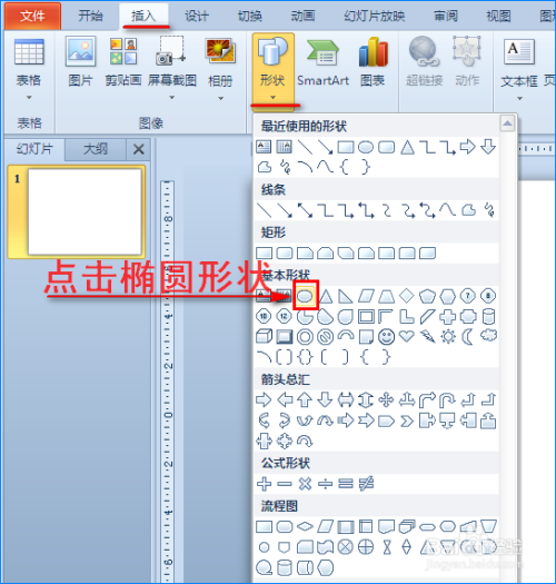 打开PPT软件,点击“插入”菜单,在子菜单中我们单击“外形”选项,然后在其扩展框中点击“椭圆”外形。如图所示: