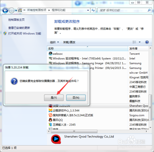 弹出快播卸载窗口,点击【是】,确认彻底删除快播及其相关组件。