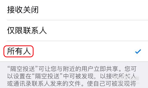 点击通用今后,我们即可看到“隔空投送”功能了,不外想要利用该功能,首先就要将其设置为“所有人”,如许别人才能搜刮到我们的设备;