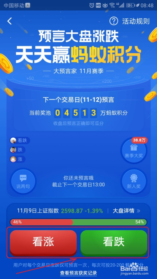 蚂蚁积分相信大师还不知道怎么获取积分,此刻付出宝有这个预言年夜盘涨跌活动就有机遇获得蚂蚁积分,可是活动时候有限,若有需要积分的赶紧加入这个预言活动吧。