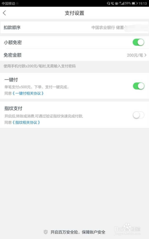 进入“付出设置”界面后,我们便可看到“一键付”的选项,此时厥后的按钮是封闭着的。