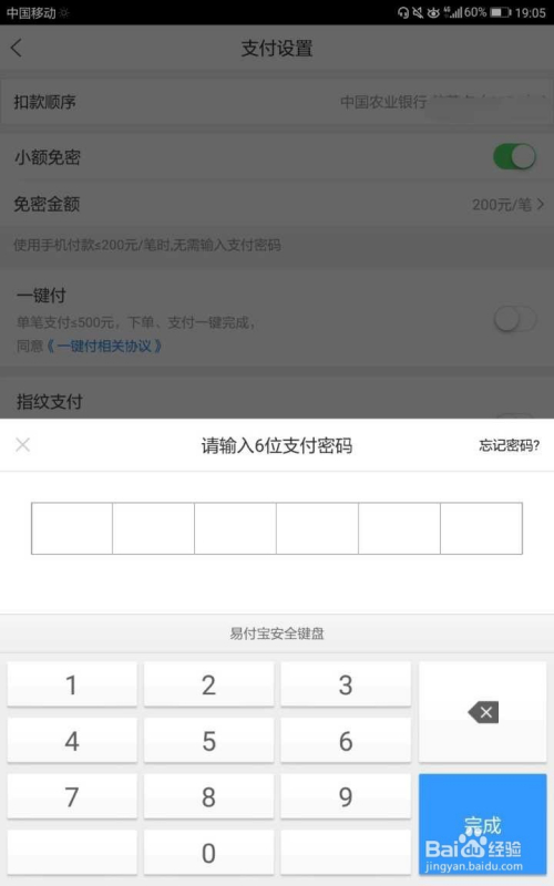 接着,我们只需点击开启“付出设置”界面下“一键付”后的按钮,在弹出的“输入6位付出密码”页面中输入密码即可。