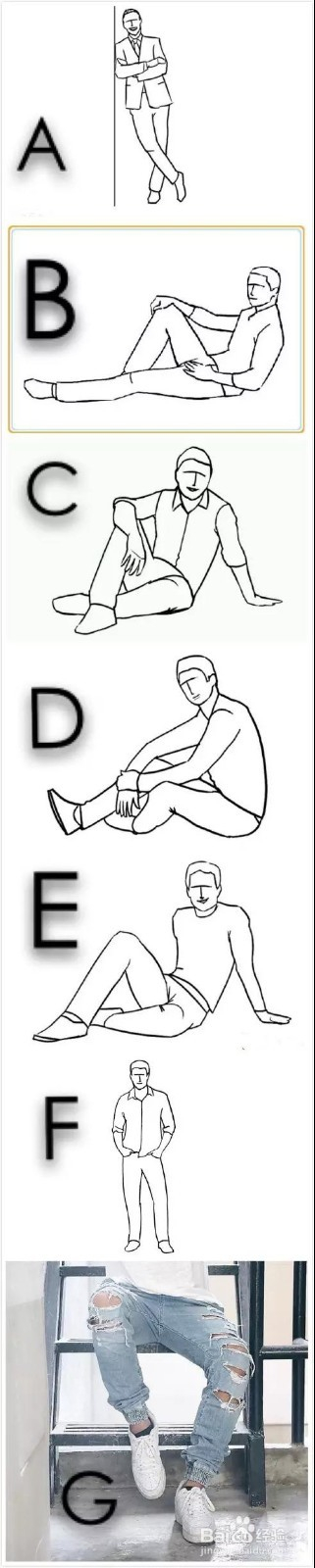 后背+看远方+手天然的放在膝盖上+腿D