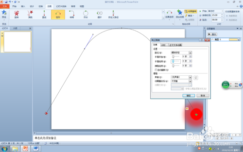 第七步:单击“高级动画”组的“动画窗格”按钮便打开右侧的动画窗格,右击动画窗格中动作路径动画结果,在弹出的下拉列表中选择“结果选项”,在打开的对话框中设置“光滑起头:0秒”、“光滑竣事:0秒”,最后单击“确定”即可。