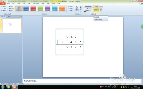 第六步:在“画图边框”组中单击“绘制表格”按钮,鼠标酿成一支笔外形,在加法竖式和上面绘制一条横线,然后再单击“绘制表格”按钮打消绘制。
