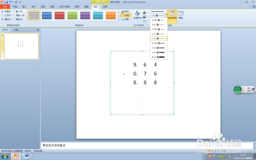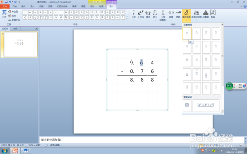 第六步:最后在PPT2010平分别选中要借位的数字6及9,单击“插入”选项卡,在“符号”组单击“公式”按钮,在弹出的下拉列表中选择“插入新公式”,在打开的“公式东西”中单击“布局”组的“导数符号”,在睁开的列表中选择“点”样式,数字6及8前面就添加一个“点”模板,从头点窜两个数字即可。