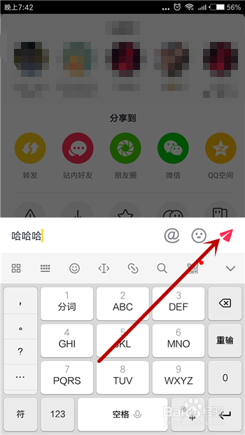 然后会鄙人方呈现转发的文字介绍,在这里介绍一下为什么转发,然后点击右侧的转发按钮,如图所示。